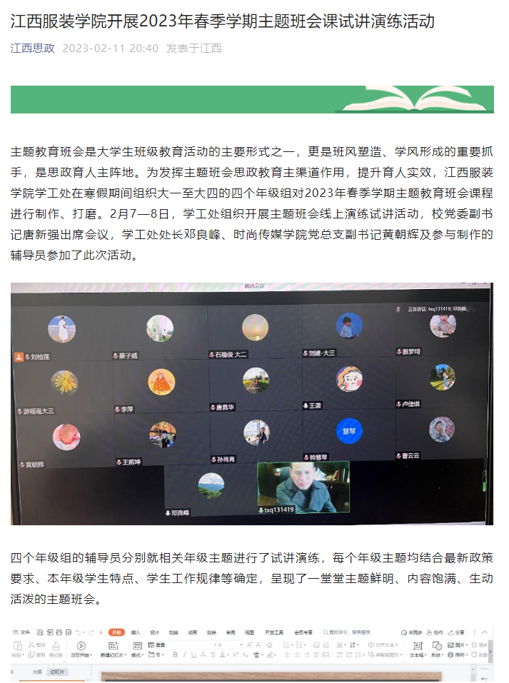 主题教育班会是大学生班级教育活动的主要形式之一,更是班风塑造、学风形成的重要抓手,是思政育人主阵地。为发挥主题班会思政教育主渠道作用,提升育人实效,万象城平台学工处在寒假期间组织大一至大四的四个年级组对2023年春季学期主题教育班会课程进行制作、打磨。2月7—8日,学工处组织开展主题班会线上演练试讲活动,校党委副书记唐新强出席会议,学工处处长邓良峰、时尚传媒学院党总支副书记黄朝辉及参与制作的辅导员参加了此次活动。