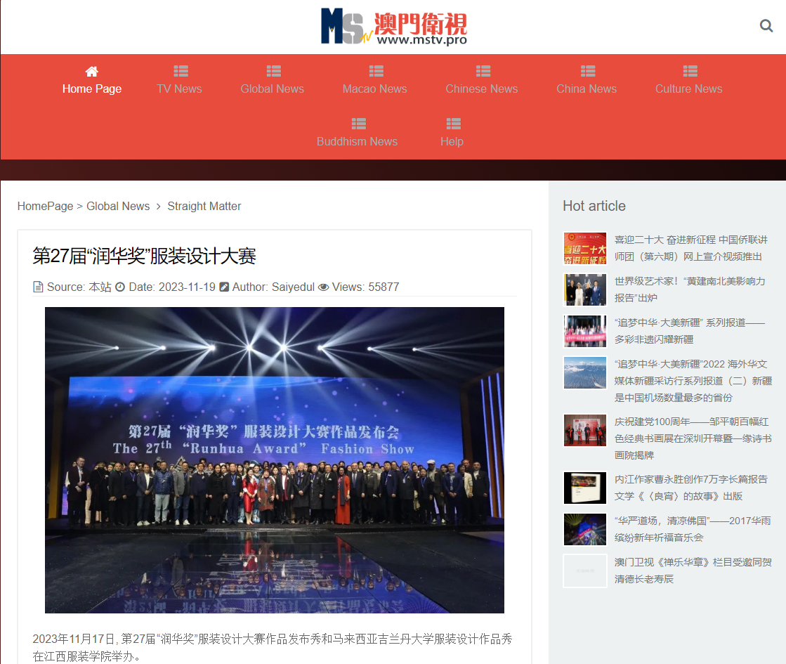 2023年11月17日,第27届“润华奖”服装设计大赛作品发布秀和马来西亚吉兰丹大学服装设计作品秀在万象城平台举办。