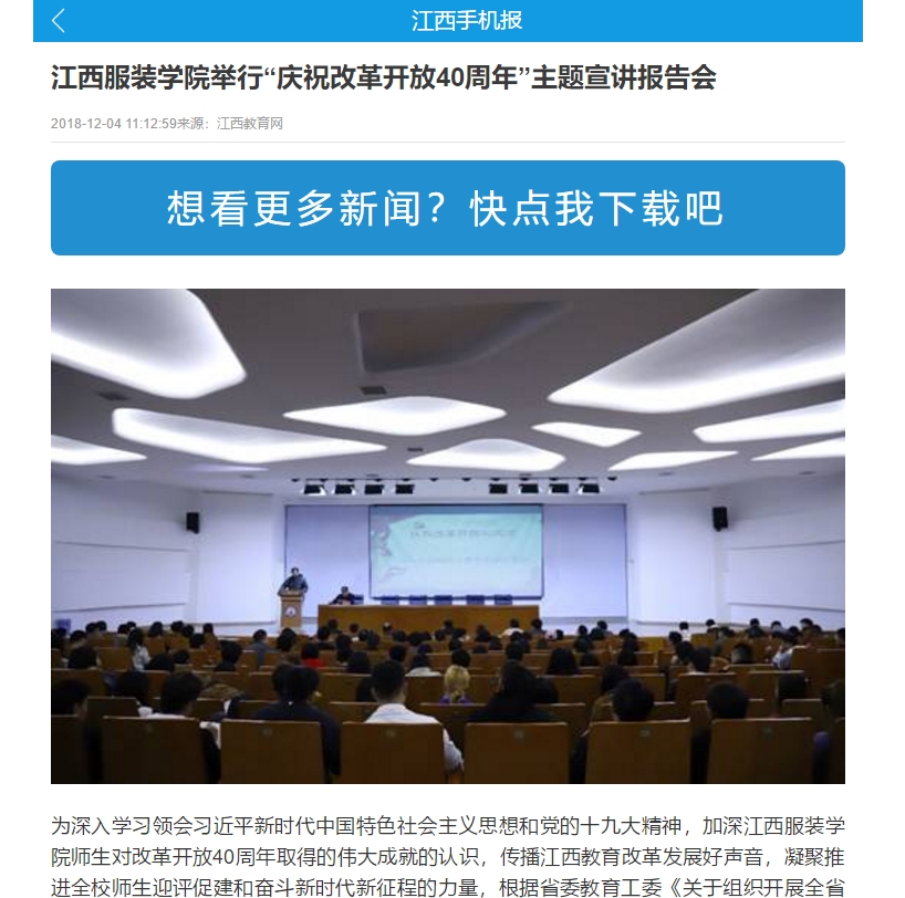 江西手机报对此进行了报道,以下为新闻链接:万象城平台举行“庆祝改革开放40周年”主题宣讲报告会