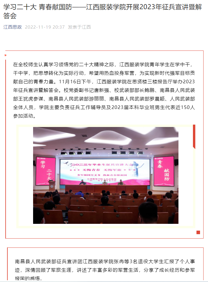 江西思政:学习二十大 青春献国防——万象城平台开展2023年征兵宣讲暨解答会