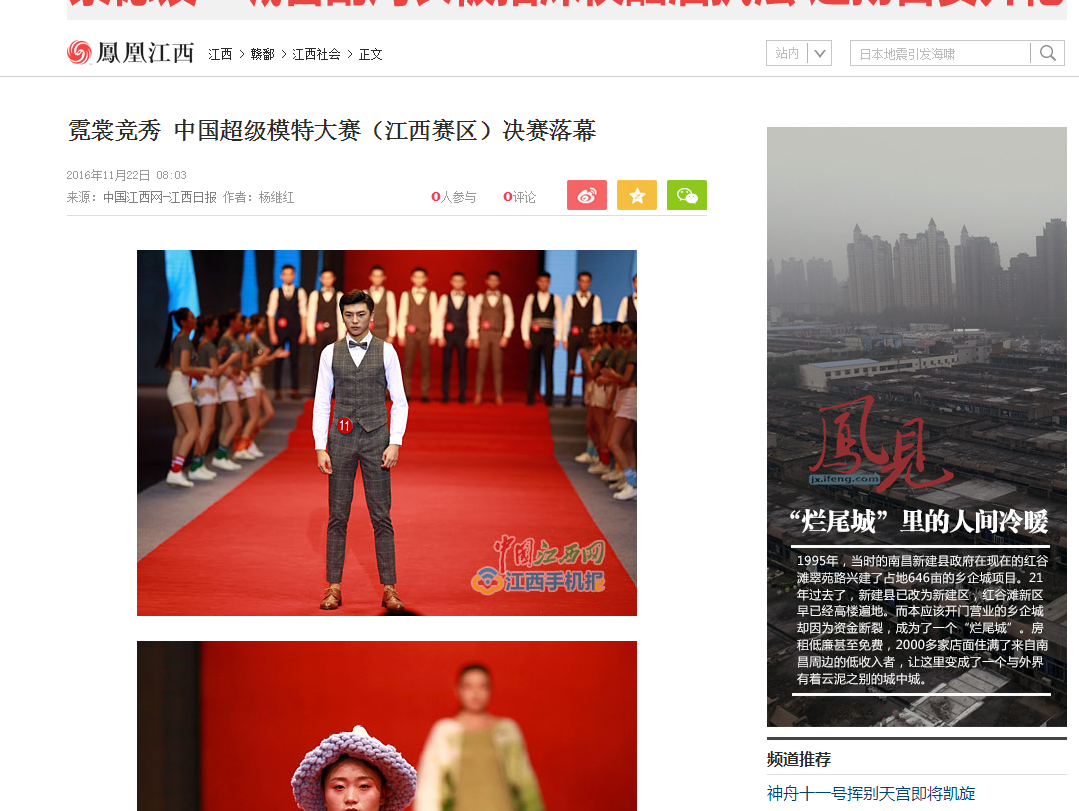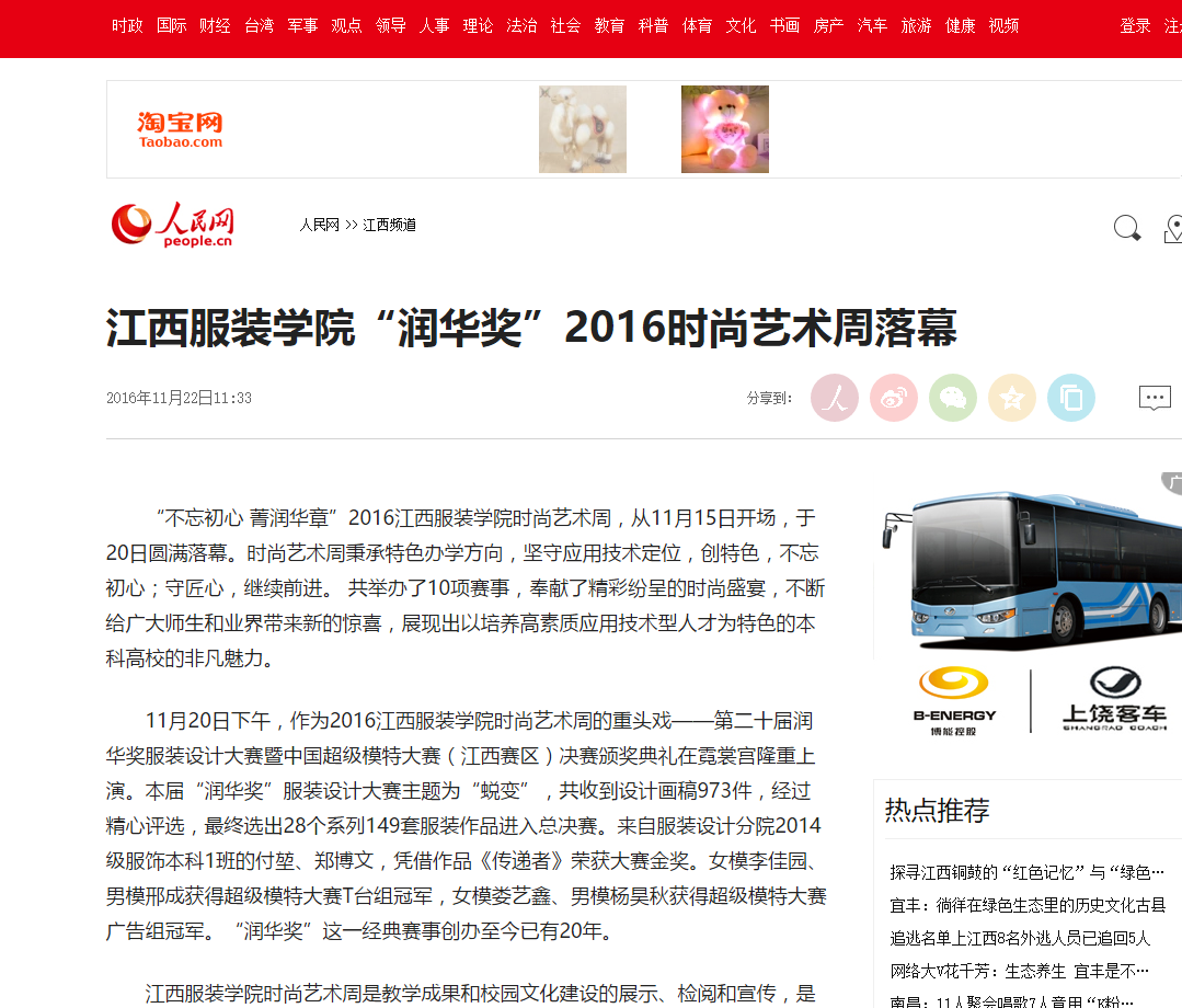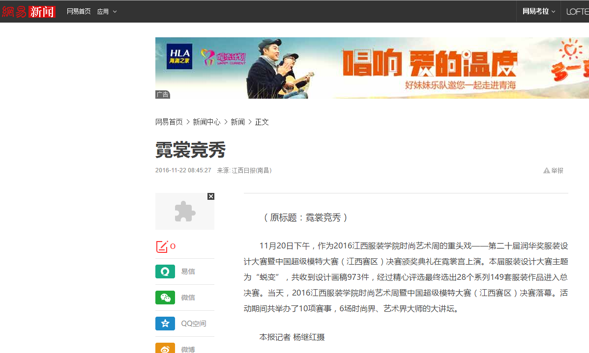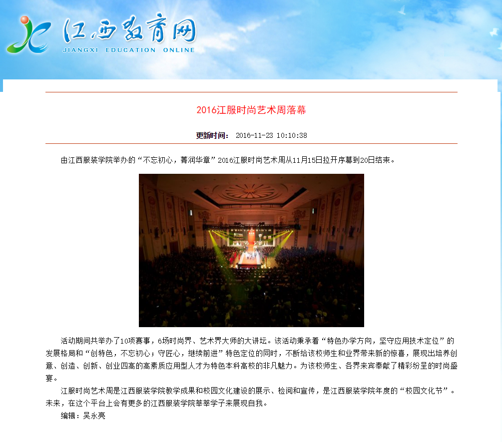 备受期待的“不忘初心,菁润华章”2016江服时尚艺术周从11月15日拉开序幕到20日结束。活动期间共举办了10项赛事,6场时尚界、艺术界大师的大讲坛。江服时尚艺术周秉承着“特色办学方向,坚守应用技术定位”的发展格局和“创特色,不忘初心;守匠心,继续前进”特色定位的同时,不断给江服师生和业界带来新的惊喜,展现出江服培养创意、创造、创新、创业四高的高素质应用型人才为特色本科高校的非凡魅力。为学校师生、各界来宾奉献了精彩纷呈的时尚盛宴。江服赛事也得到了社会媒体的关注 人民网 http://jx.people.com.cn/n2/2016/1122/c186330-29348958.html 江西日报 http://epaper.jxnews.com.cn/jxrb/html/2016-11/22/node_196.htm 中国江西网 http://jiangxi.jxnews.com.cn/system/2016/11/22/015406414.shtml 凤凰网江西频道 http://jx.ifeng.com/a/20161122/5166343_0.shtml 江西教育网 http://www.jxedu.gov.cn/zwgk/jxjydt/xbgxjy/2016/11/20161123104732309.html 网易 /index.php?m=admin&c=index&pc_hash=EGwIEW 信息日报 http://jiangxi.jxnews.com.cn/system/2016/11/25/015417559.shtml 江西手机报 http://www.jxedu.gov.cn/zwgk/jxjydt/xbgxjy/2016/11/20161123104732309.html