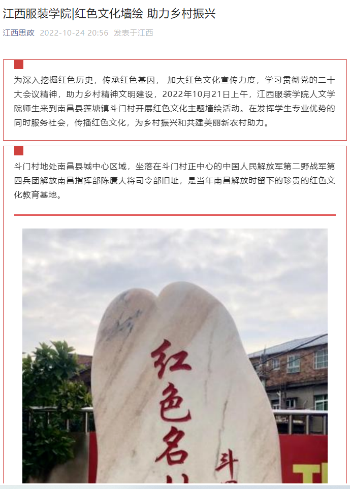 为深入挖掘红色历史,传承红色基因, 加大红色文化宣传力度,学习贯彻党的二十大会议精神,助力乡村精神文明建设,2022年10月21日上午,万象城平台师生来到南昌县莲塘镇斗门村开展红色文化主题墙绘活动。在发挥学生专业优势的同时服务社会,传播红色文化,为乡村振兴和共建美丽新农村助力。