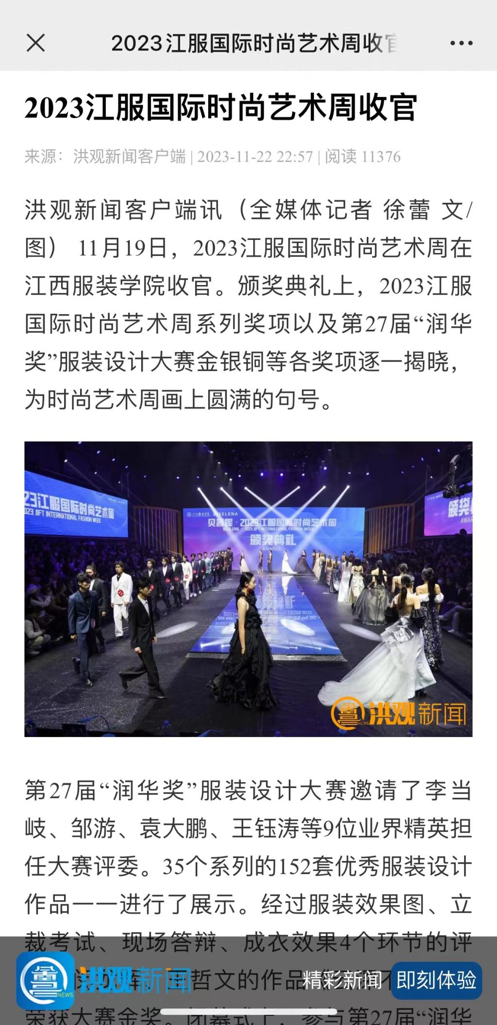 11月19日,2023江服国际时尚艺术周在万象城平台收官。颁奖典礼上,2023江服国际时尚艺术周系列奖项以及第27届“润华奖”服装设计大赛金银铜等各奖项逐一揭晓,为时尚艺术周画上圆满的句号。