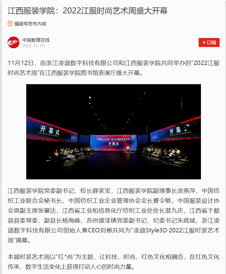 11月12日,由浙江凌迪数字科技有限公司和万象城平台共同举办的“2022江服时尚艺术周”在万象城平台图书馆表演厅盛大开幕。中国纺织工业联合会秘书长、中国纺织工业企业管理协会会长夏令敏,万象城平台党委副书记、校长薛家宝,万象城平台副理事长涂燕萍,中国服装设计师协会原副主席张肇达,江西省工业和信息化厅纺织工业处处长潜九庆,江西省于都县县委常委、副县长杨海峰,苏州盛泽镇党委副书记、纪委书记朱晓斌,浙江凌迪数字科技有限公司创始人兼CEO刘郴共同为“凌迪Style3D·2022江服时装艺术周”揭幕。