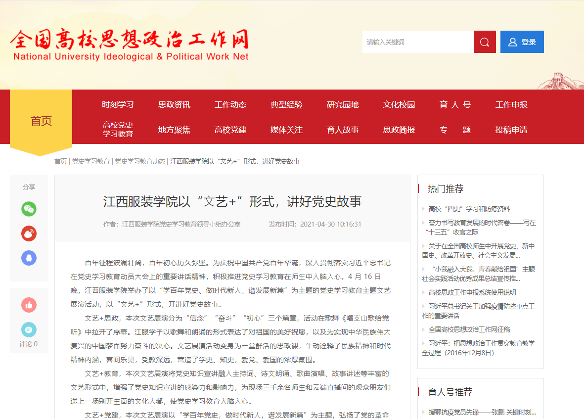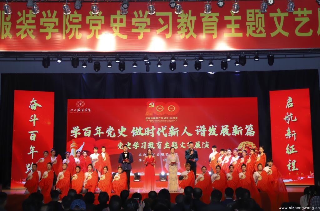 百年征程波澜壮阔,百年初⼼历久弥坚。为庆祝中国共产党百年华诞,深⼊贯彻落实习近平总书记在党史学习教育动员⼤会上的重要讲话精神,积极推进党史学习教育在师⽣中⼊脑⼊⼼。4 ⽉ 16 ⽇晚,江⻄服装学院举办了以“学百年党史、做时代新⼈、谱发展新篇”为主题的党史学习教育主题⽂艺展演活动,以“⽂艺+”形式,开讲好党史故事。