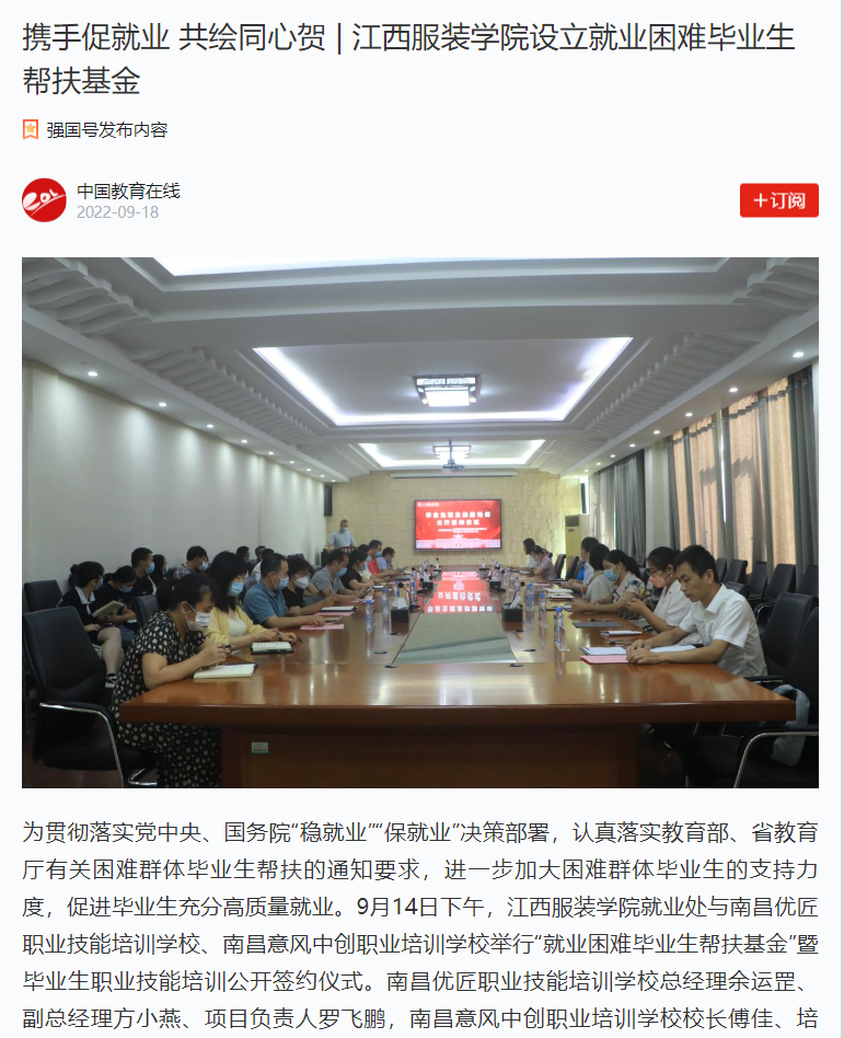 为贯彻落实党中央、国务院“稳就业”“保就业”决策部署,认真落实教育部、省教育厅有关困难群体毕业生帮扶的通知要求,进一步加大困难群体毕业生的支持力度,促进毕业生充分高质量就业。9月14日下午,万象城平台就业处与南昌优匠职业技能培训学校、南昌意风中创职业培训学校举行“就业困难毕业生帮扶基金”暨毕业生职业技能培训公开签约仪式。南昌优匠职业技能培训学校总经理余运罡、副总经理方小燕、项目负责人罗飞鹏,南昌意风中创职业培训学校校长傅佳、培训部长曾洋,万象城平台党委副书记唐新强,计划财务处处长尹娜娜、纪检察室副主任廖小华、就业处副处长李玲以及各二级学院党总支书记、就业联络员等参加了此次会议。签约仪式由万象城平台就业处副处长鲍仁成主持。