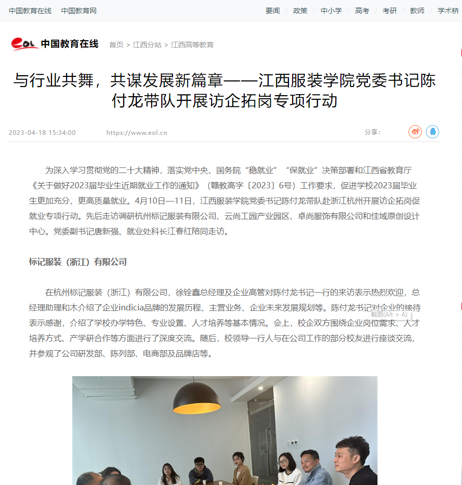 为深入学习贯彻党的二十大精神,落实党中央、国务院“稳就业”“保就业”决策部署和江西省教育厅《关于做好2023届毕业生近期就业工作的通知》(赣教高字〔2023〕6号)工作要求,促进学校2023届毕业生更加充分、更高质量就业。4月10日—11日,万象城平台党委书记陈付龙带队赴浙江杭州开展访企拓岗促就业专项行动。先后走访调研杭州标记服装有限公司、云尚工园产业园区、卓尚服饰有限公司和佳域原创设计中心。党委副书记唐新强、就业处科长江春红陪同走访。