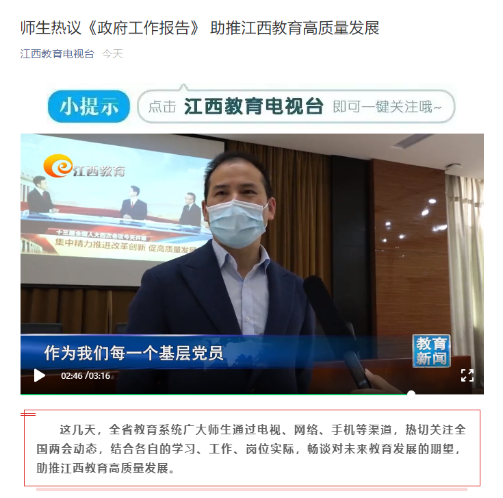 以下为视频新闻链接(第2分46秒):江西教育电视台:师生热议《政府工作报告》 助推江西教育高质量发展