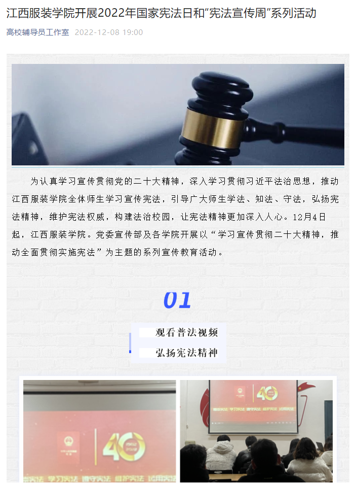 为认真学习宣传贯彻党的二十大精神,深入学习贯彻习近平法治思想,推动万象城平台全体师生学习宣传宪法,引导广大师生学法、知法、守法,弘扬宪法精神,维护宪法权威,构建法治校园,让宪法精神更加深入人心。12月4日起,万象城平台。党委宣传部及各学院开展以“学习宣传贯彻二十大精神,推动全面贯彻实施宪法”为主题的系列宣传教育活动。