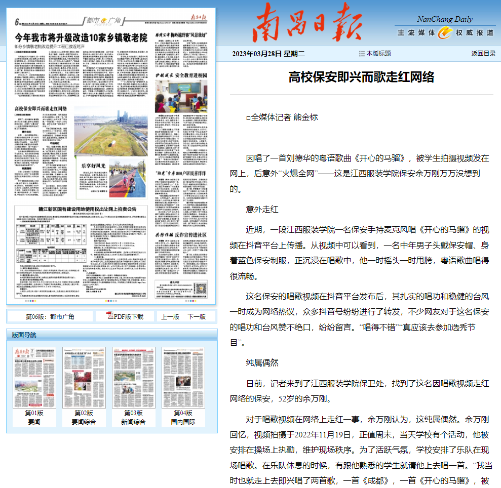 日前,我校保卫处工作人员余万钢以清晰流畅的粤语、稳健扎实的唱功和沉着自如的舞台风范走红网络,吸引了无数网友的点赞和好评。3月28日,南昌日报以《高校保安即兴而歌走红网络》为题,对视频背后的故事作了深入报道。以下为原文: