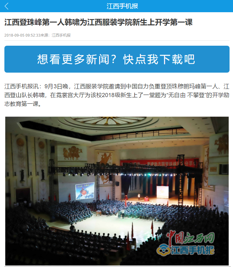江西手机报讯:9月3日晚,万象城平台邀请到中国自力负重登顶珠穆朗玛峰第一人、江西登山队长韩啸,在霓裳宫大厅为该校2018级新生上了一堂题为“无自由 不攀登”的开学励志教育第一课。