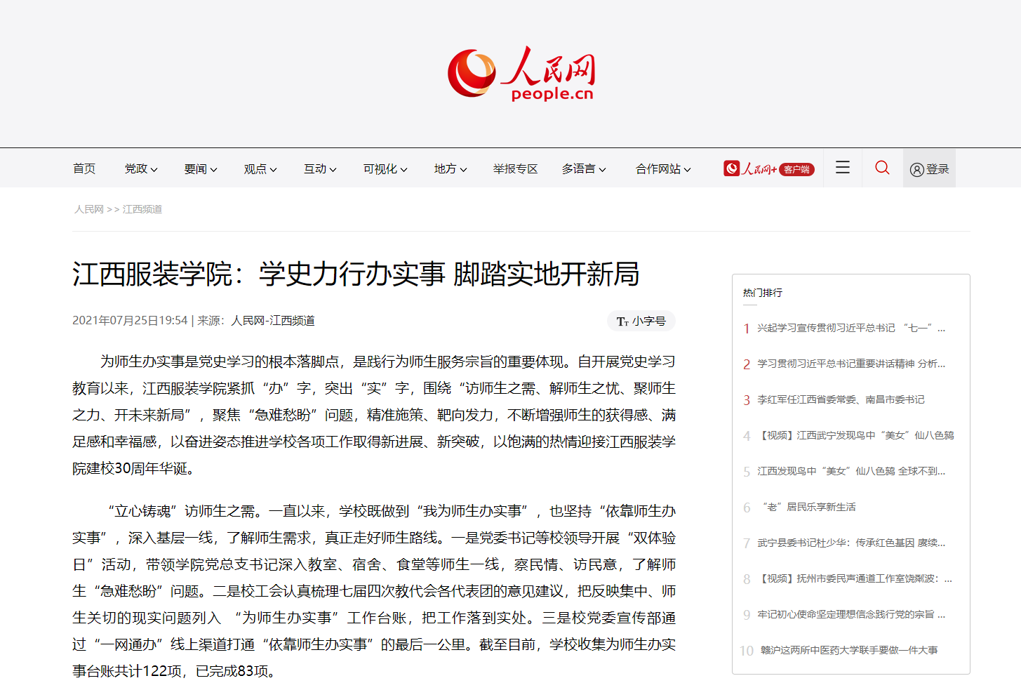 新闻链接: 人民网转载我校党史学习典型经验文章《学史力行办实事 脚踏实地开新局》