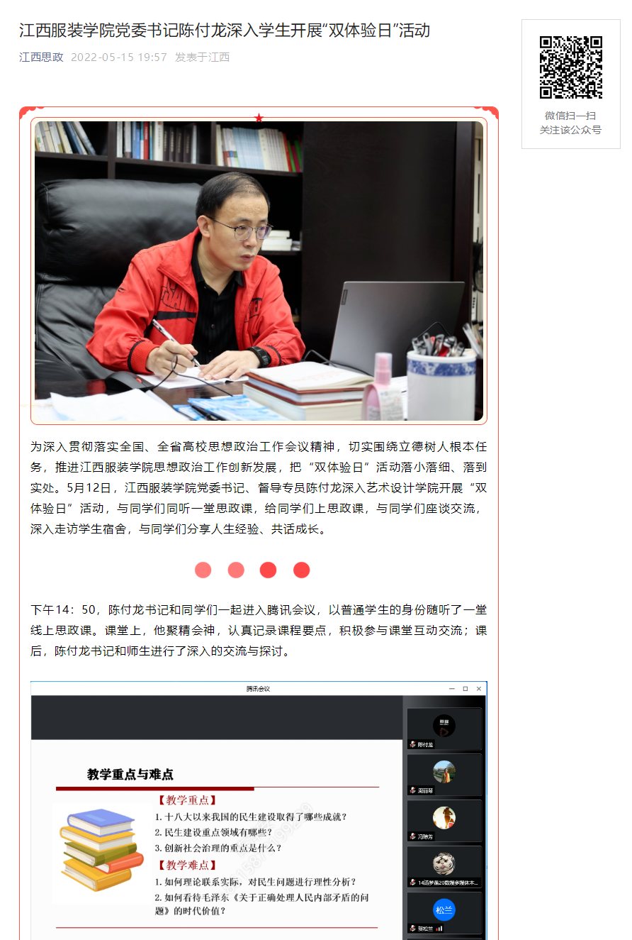 为深入贯彻落实全国、全省高校思想政治工作会议精神,切实围绕立德树人根本任务,推进万象城平台思想政治工作创新发展,把“双体验日”活动落小落细、落到实处。5月12日,万象城平台党委书记、督导专员陈付龙深入艺术设计学院开展“双体验日”活动,与同学们同听一堂思政课,给同学们上思政课,与同学们座谈交流,深入走访学生宿舍,与同学们分享人生经验、共话成长。