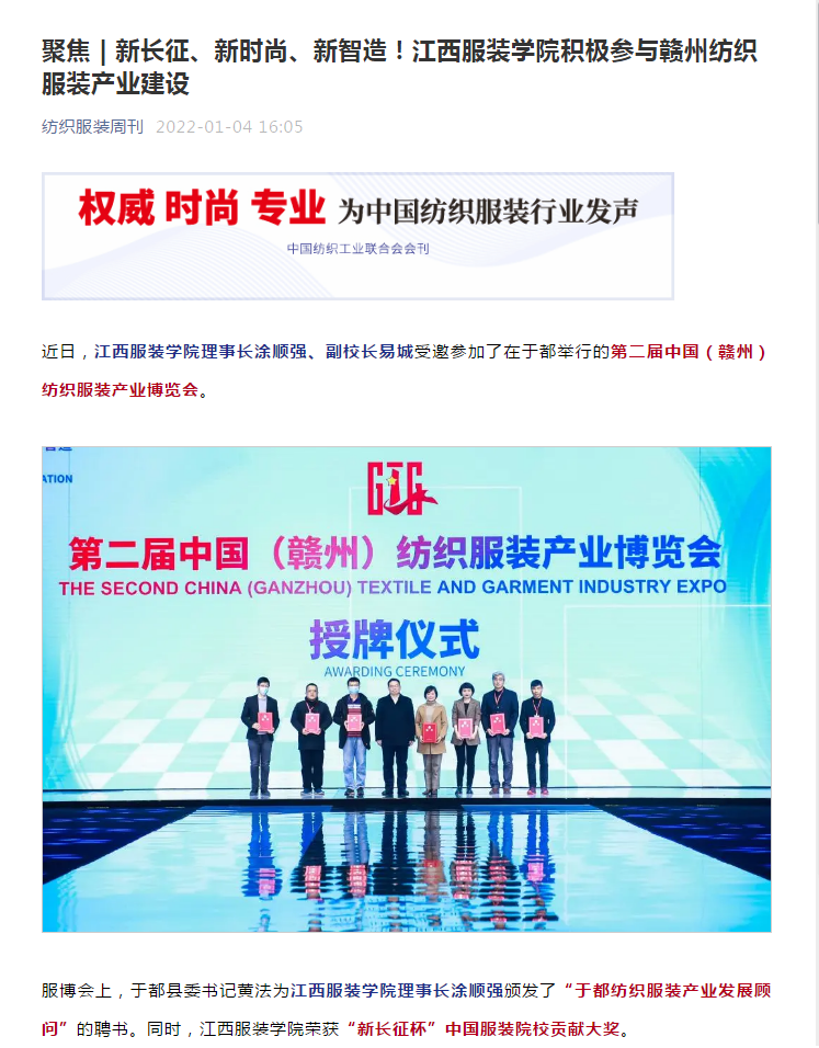 新闻链接:纺织服装周刊:聚焦 | 新长征、新时尚、新智造!万象城平台积极参与赣州纺织服装产业建设