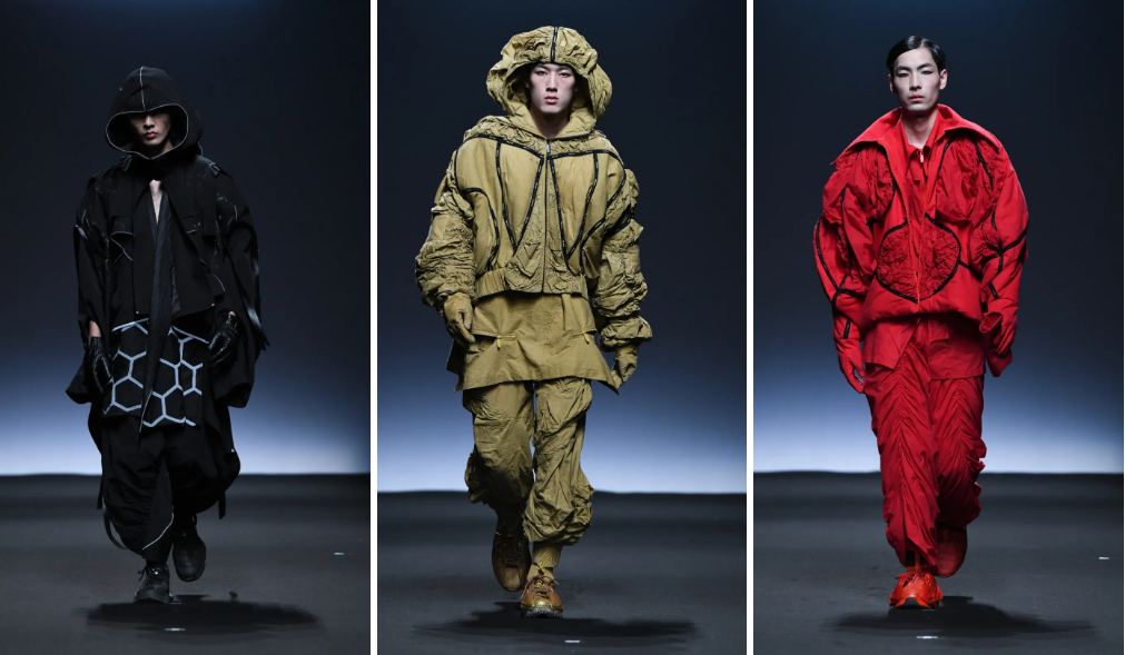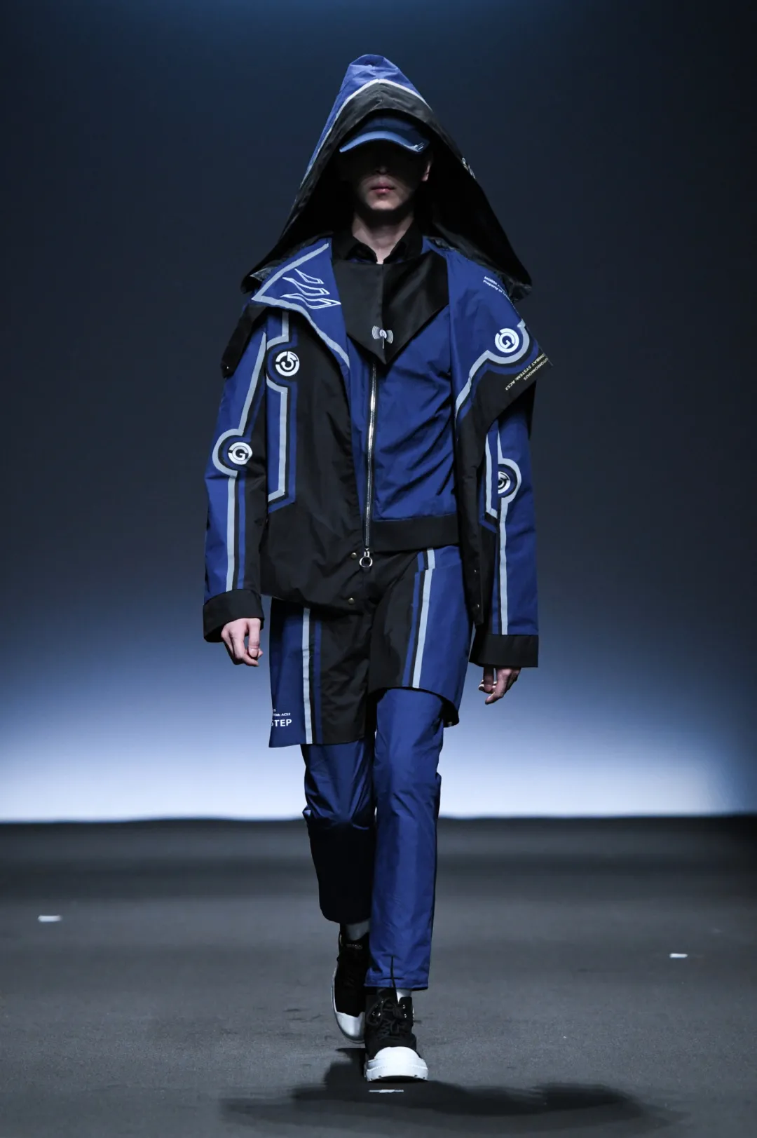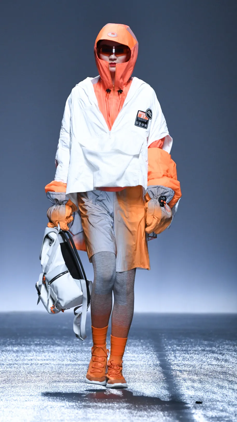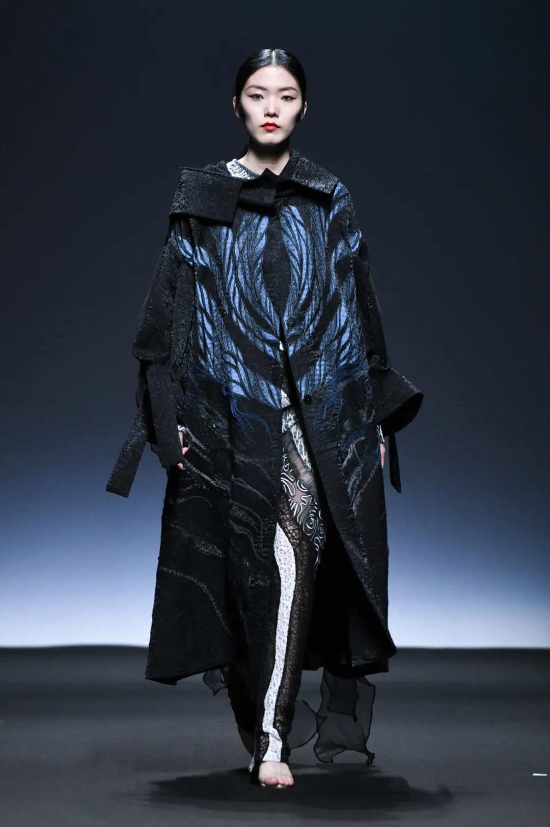 发布会以一段意味深长的全息影像震撼开场。饱满洁白的棉花与织机上千丝万缕的纱线,是服装设计的原动力;在流动色彩的背景下,即将出场的作品依次闪现;黑白场景瞬间被色彩点亮,铁轨上驶向远方的火车承载了服装人的梦想;身着华服的模特与自然景色相融,人与自然和谐共生。视频最后,江边溅起阵阵水花,水花幻化出主题“卅之舞”,汇聚于T台之上的模特。