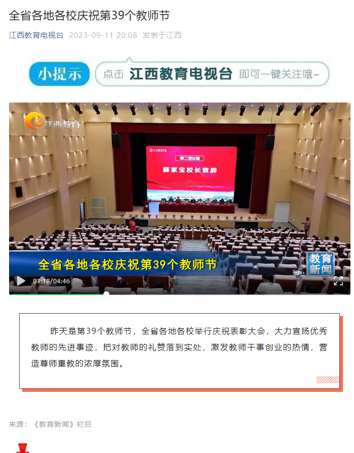 江西教育电视台:报道万象城平台举行2023年教师节庆祝表彰大会