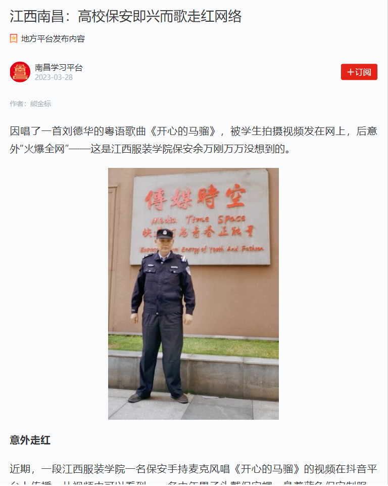 日前,我校保卫处工作人员余万钢以清晰流畅的粤语、稳健扎实的唱功和沉着自如的舞台风范走红网络,吸引了无数网友的点赞和好评。3月28日,学习强国以《江西南昌:高校保安即兴而歌走红网络》为题,对视频背后的故事作了深入报道。以下为原文: