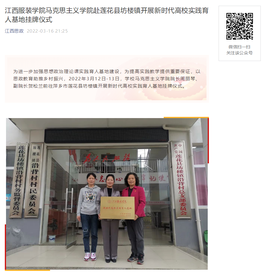 为进一步加强思想政治理论课实践育人基地建设,为提高实践教学提供重要保证,以思政教育助推乡村振兴,2022年3月12日-13日,学校马克思主义学院院长周丽琴、副院长贺松兰前往萍乡市莲花县坊楼镇开展新时代高校实践育人基地挂牌仪式。
