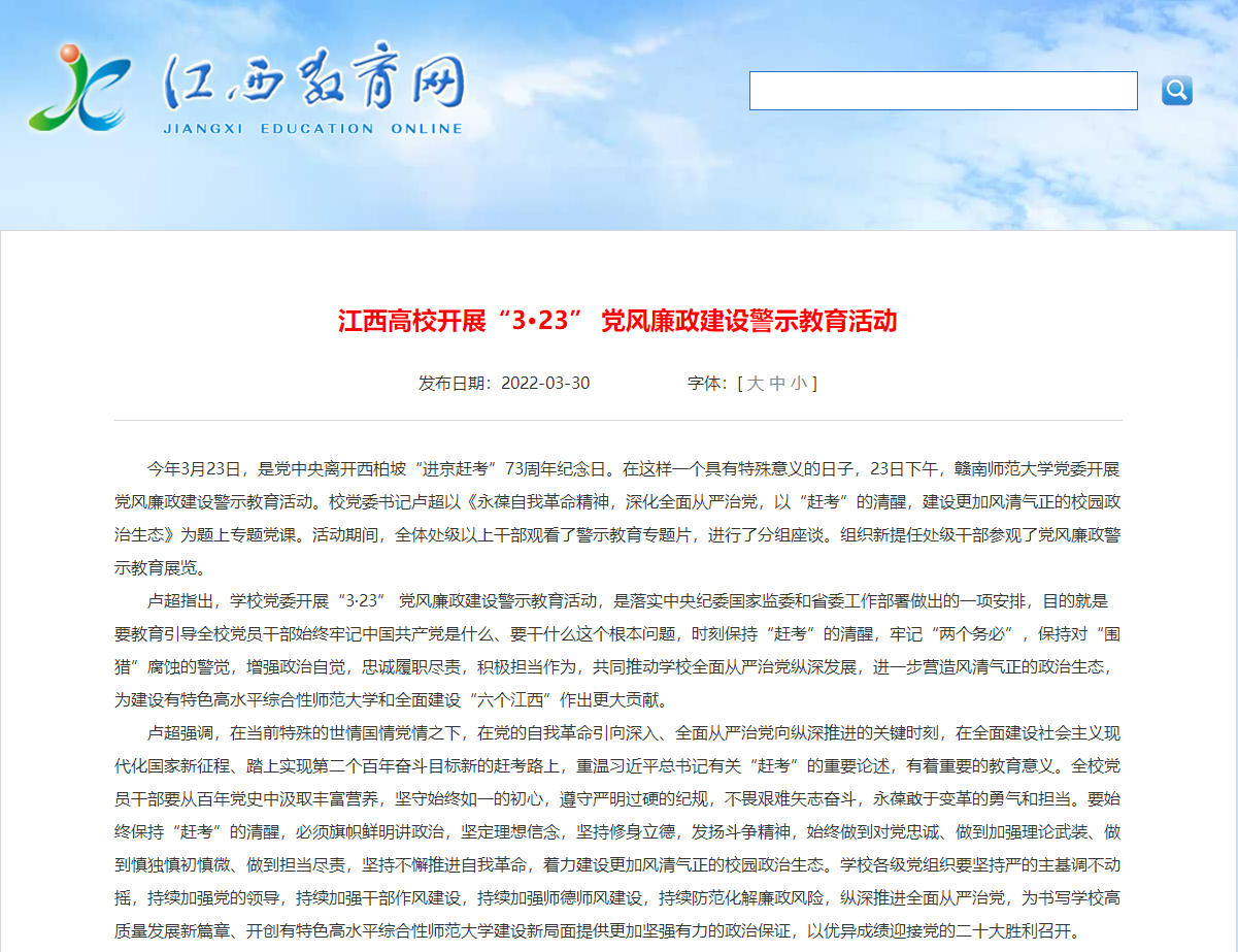 今年3月23日,是党中央离开西柏坡“进京赶考”73周年纪念日。在这样一个具有特殊意义的日子,我校党委开展党风廉政建设警示教育活动,受到江西教育网报道。以下为新闻链接: