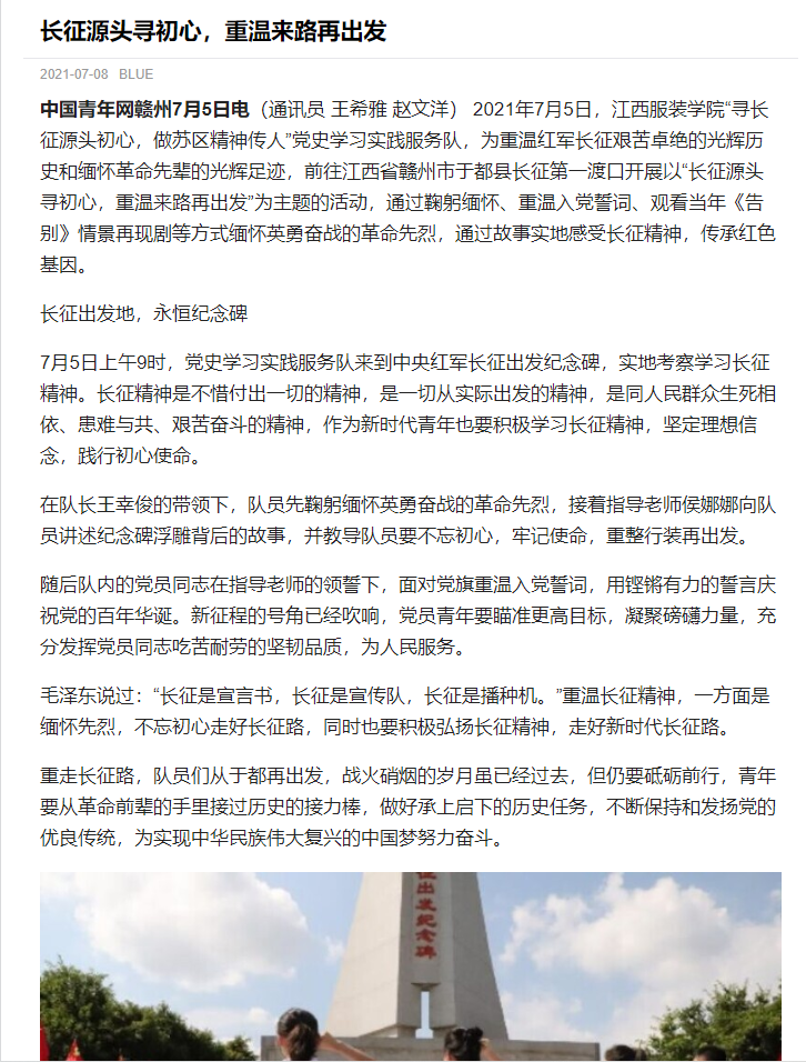新闻链接:中国青年网报道我校“三下乡”暑期社会实践活动:长征源头寻初心,重温来路再出发