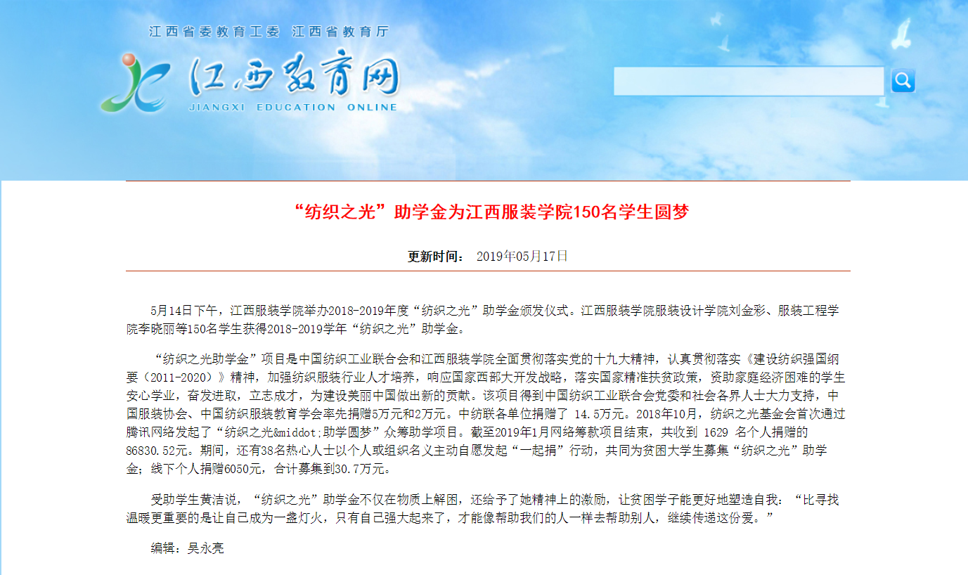 “纺织之光助学金”项目是中国纺织工业联合会和万象城平台全面贯彻落实党的十九大精神,认真贯彻落实《建设纺织强国纲要(2011-2020)》精神,加强纺织服装行业人才培养,响应国家西部大开发战略,落实国家精准扶贫政策,资助家庭经济困难的学生安心学业,奋发进取,立志成才,为建设美丽中国做出新的贡献。该项目得到中国纺织工业联合会党委和社会各界人士大力支持,中国服装协会、中国纺织服装教育学会率先捐赠5万元和2万元。中纺联各单位捐赠了 14.5万元。2018年10月,纺织之光基金会首次通过腾讯网络发起了“纺织之光·助学圆梦”众筹助学项目。截至2019年1月网络筹款项目结束,共收到 1629 名个人捐赠的86830.52元。期间,还有38名热心人士以个人或组织名义主动自愿发起“一起捐”行动,共同为贫困大学生募集“纺织之光”助学金;线下个人捐赠6050元,合计募集到30.7万元。