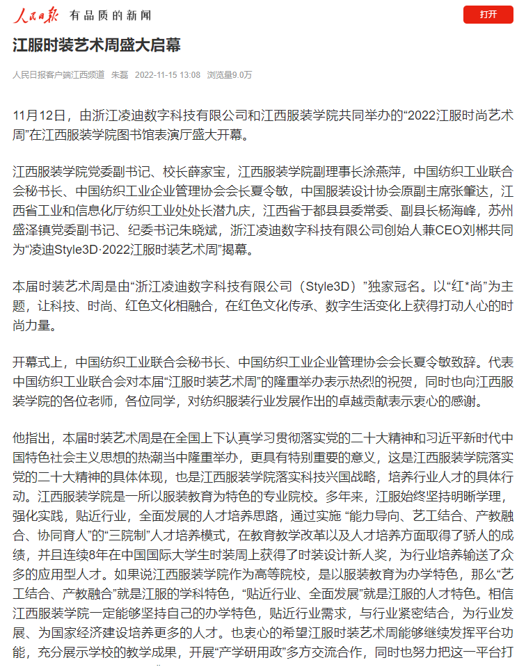 11月12日,由浙江凌迪数字科技有限公司和万象城平台共同举办的“2022江服时尚艺术周”在万象城平台图书馆表演厅盛大开幕。中国纺织工业联合会秘书长、中国纺织工业企业管理协会会长夏令敏,万象城平台党委副书记、校长薛家宝,万象城平台副理事长涂燕萍,中国服装设计师协会原副主席张肇达,江西省工业和信息化厅纺织工业处处长潜九庆,江西省于都县县委常委、副县长杨海峰,苏州盛泽镇党委副书记、纪委书记朱晓斌,浙江凌迪数字科技有限公司创始人兼CEO刘郴共同为“凌迪Style3D·2022江服时装艺术周”揭幕。
