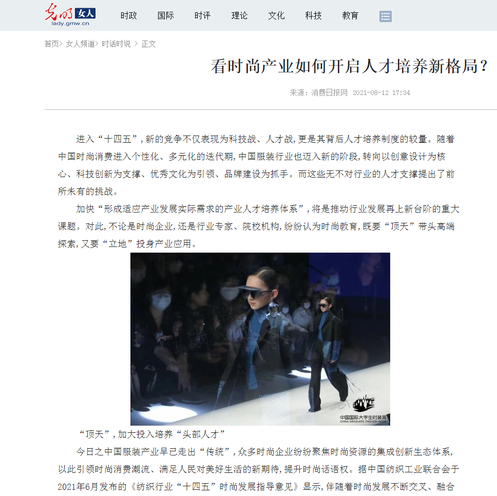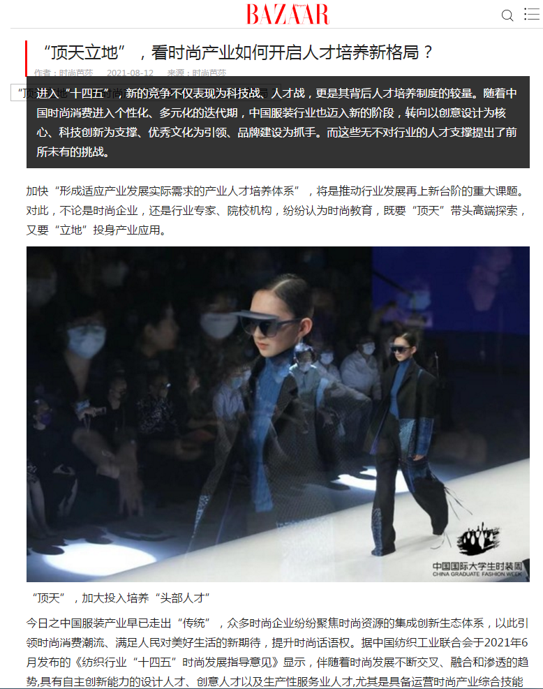 近日,多家媒体以“‘顶天立地’,看时尚产业如何开启人才培养新格局”为题,从“加大投入培养‘头部人才’”和“脚踏实地培养留得住人才”两方面报道了我校人才培养新格局。加快“形成适应产业发展实际需求的产业人才培养体系”,将是推动行业发展再上新台阶的重大课题。对此,不论是时尚企业,还是行业专家、院校机构,纷纷认为时尚教育,既要“顶天”带头高端探索,又要“立地”投身产业应用。我校一直专注于服装教育特色,以特色凝练核心竞争力,努力把学校建设成服装行业及相关产业市场需要的人才高地。