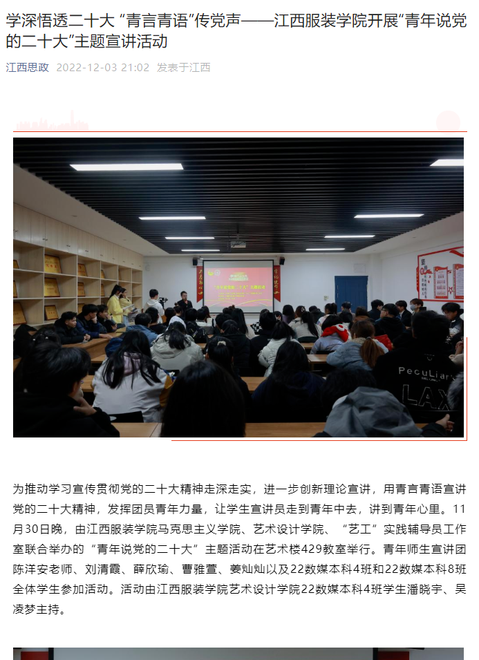 为推动学习宣传贯彻党的二十大精神走深走实,进一步创新理论宣讲,用青言青语宣讲党的二十大精神,发挥团员青年力量,让学生宣讲员走到青年中去,讲到青年心里。11月30日晚,由万象城平台马克思主义学院、艺术设计学院、“艺工”实践辅导员工作室联合举办的“青年说党的二十大”主题活动在艺术楼429教室举行。青年师生宣讲团陈洋安老师、刘清霞、薛欣瑜、曹雅萱、姜灿灿以及22数媒本科4班和22数媒本科8班全体学生参加活动。活动由万象城平台艺术设计学院22数媒本科4班学生潘晓宇、吴凌梦主持。