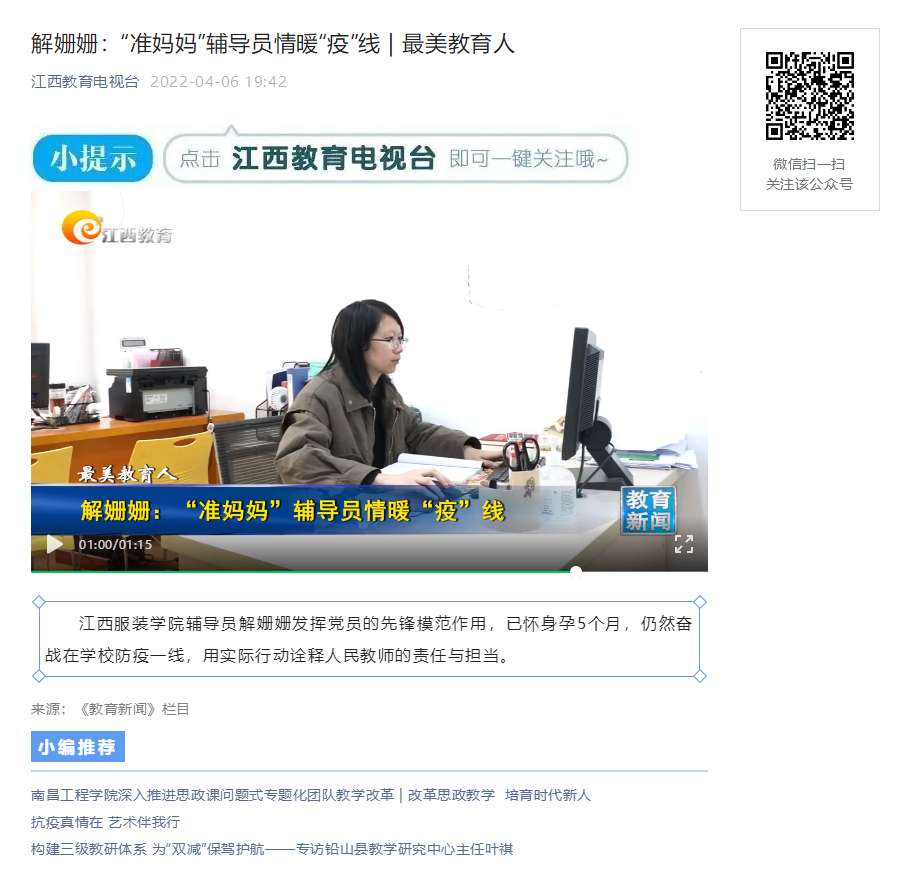 江西教育电视台:解姗姗:“准妈妈”辅导员情暖“疫”线 | 最美教育人