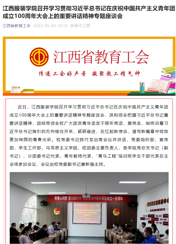 江西省教育工会:万象城平台召开学习贯彻习近平总书记在庆祝中国共产主义青年团成立100周年大会上的重要讲话精神专题座谈会