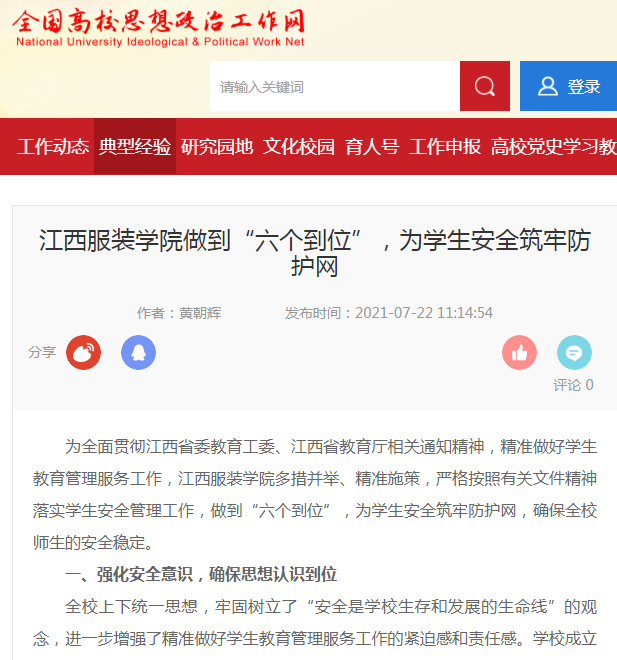 教育部思政司全国高校思想政治工作网“典型经验”板块刊载我校“做到‘六个到位’,为学生安全筑牢防护网”一文,受到全国高校广泛关注。