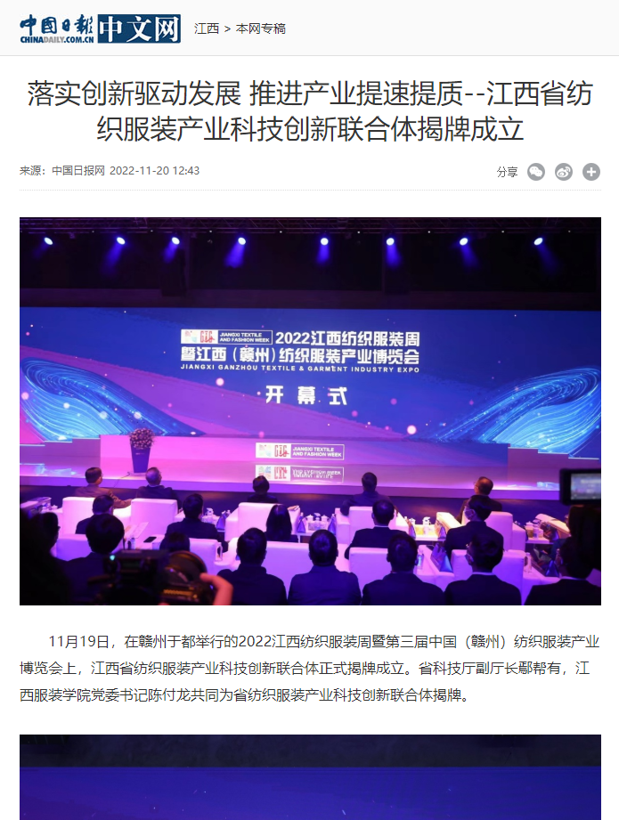 中国日报:落实创新驱动发展 推进产业提速提质--江西省纺织服装产业科技创新联合体揭牌成立