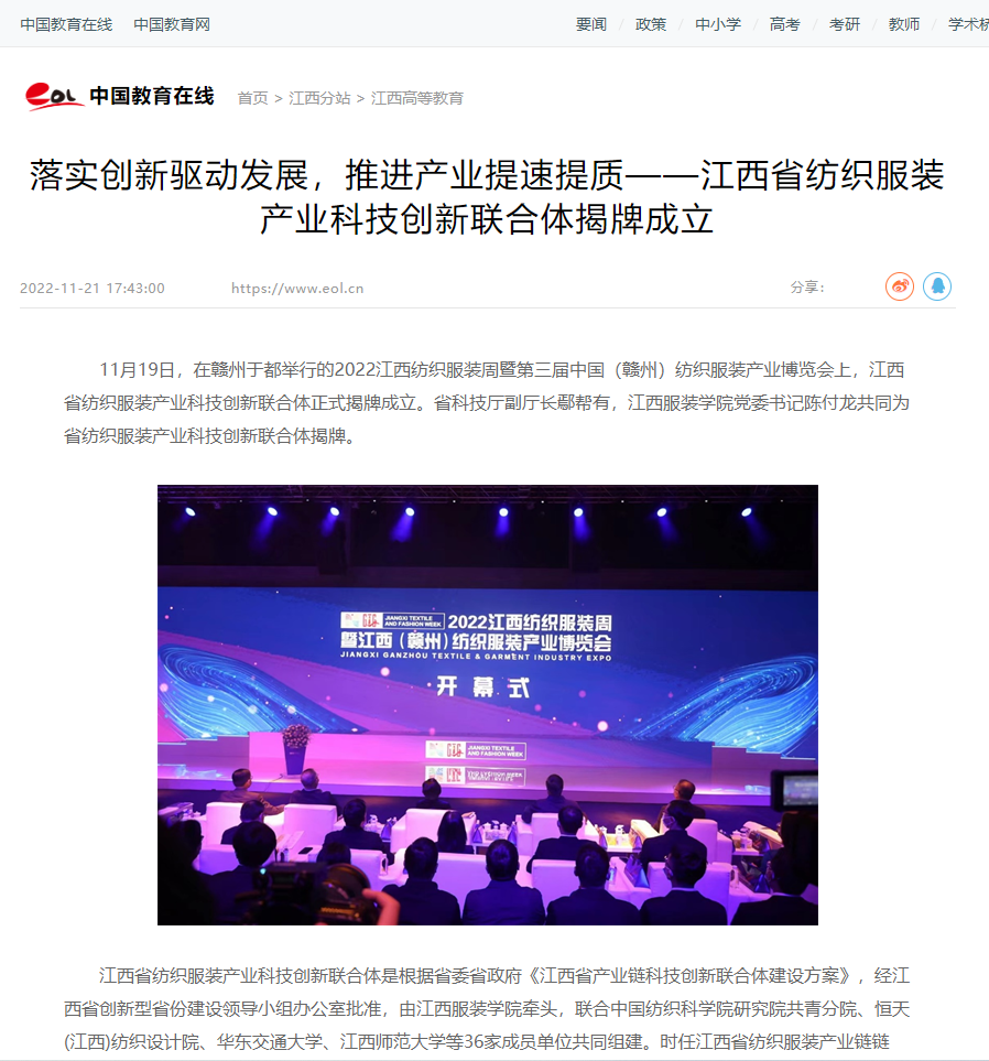 中国教育在线:落实创新驱动发展,推进产业提速提质——江西省纺织服装产业科技创新联合体揭牌成立