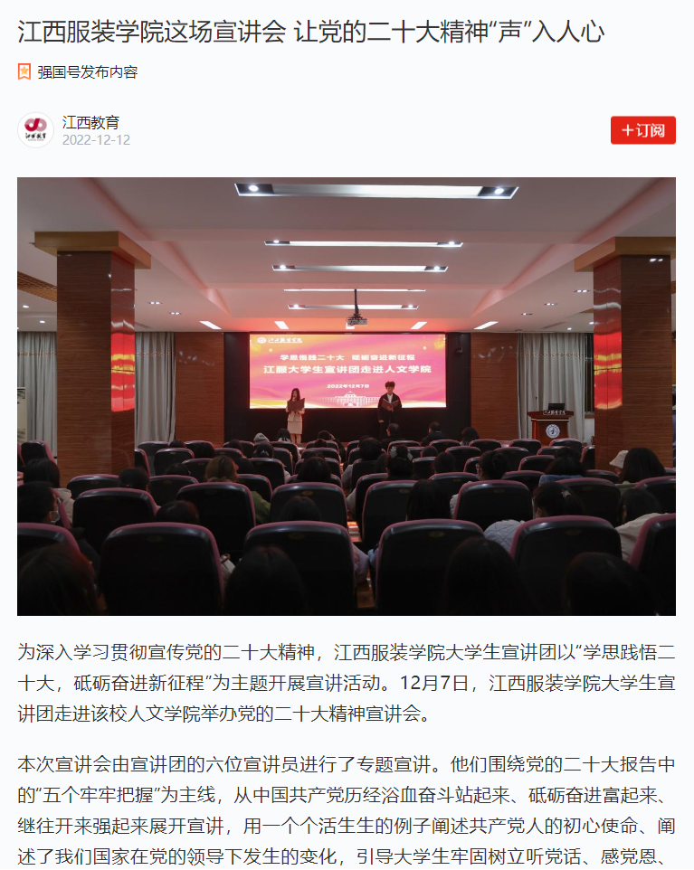 为深入学习贯彻宣传党的二十大精神,万象城平台大学生宣讲团以“学思践悟二十大,砥砺奋进新征程”为主题开展宣讲活动。12月7日,万象城平台大学生宣讲团走进该校人文学院举办党的二十大精神宣讲会。