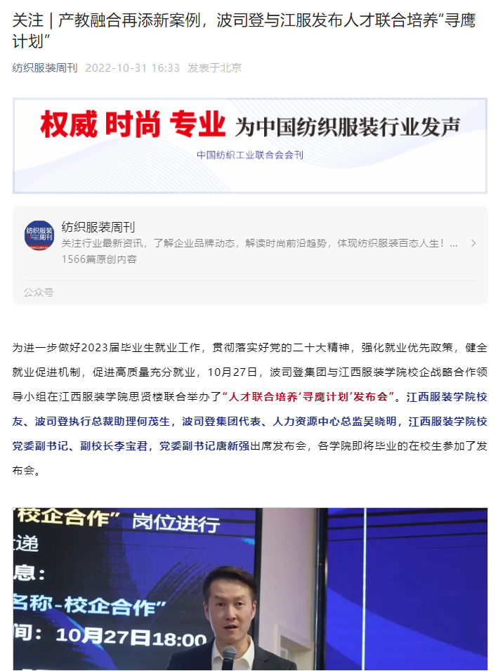 纺织服装周刊:关注|产教融合再添新案例,波司登与江服发布人才联合培养“寻鹰计划”