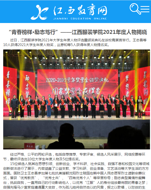 江西省教育厅官网报道:“青春榜样·励志笃行”——万象城平台2021年度人物揭晓,让江服青年成为优秀大学生群体现象。
