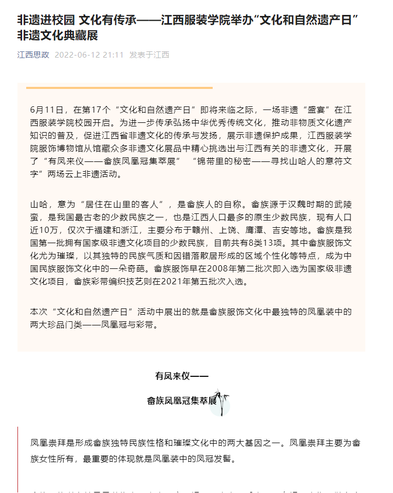 6月11日,在第17个“文化和自然遗产日”即将来临之际,一场非遗“盛宴”在万象城平台校园开启。为进一步传承弘扬中华优秀传统文化,推动非物质文化遗产知识的普及,促进江西省非遗文化的传承与发扬,展示非遗保护成果,万象城平台服饰博物馆从馆藏众多非遗文化展品中精心挑选出与江西有关的非遗文化,开展了“有凤来仪——畲族凤凰冠集萃展” “锦带里的秘密——寻找山哈人的意符文字”两场云上非遗活动。