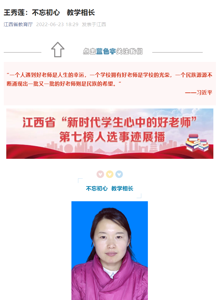 文章链接:江西省教育厅报道我校教师:王秀莲:不忘初心 教学相长