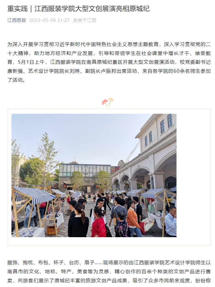 为深入开展学习贯彻习近平新时代中国特色社会主义思想主题教育,深入学习贯彻党的二十大精神,助力地方经济和产业发展,引导和带领学生在社会课堂中增长才干、接受教育,5月1日上午,我校在南昌原城纪景区开展大型文创展演活动,校党委副书记唐新强、艺术设计学院院长刘琳、副院长卢振邦出席活动,来自各学院的60余名师生参加了活动。