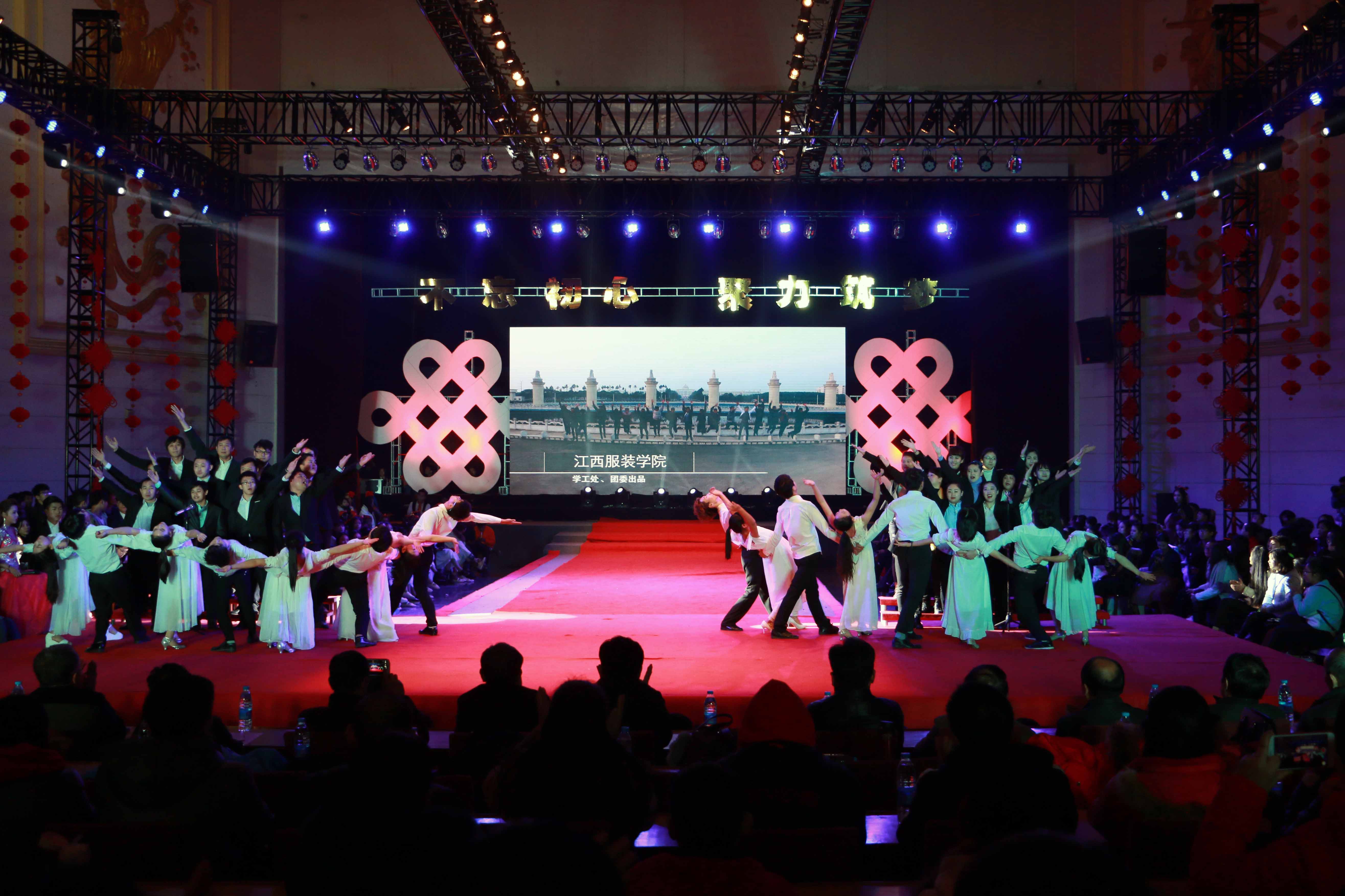 服装报讯(记者/林慧萍 廖智力)猴跃鸡鸣逢盛世,莺歌燕舞庆新年。12月27日下午,我校霓裳宫内流光溢彩,歌舞欢腾,处处洋溢着节日的欢愉气氛。我校“不忘初心,聚力筑梦”2017年师生元旦联欢会在此隆重上演。校领导王建元、陈万龙、温容祯、杨汉东、杨涛、高建国、胡放出席晚会,与3000余名师生员工齐聚一堂,欢送硕果累累的2016,喜迎充满希望的2017。