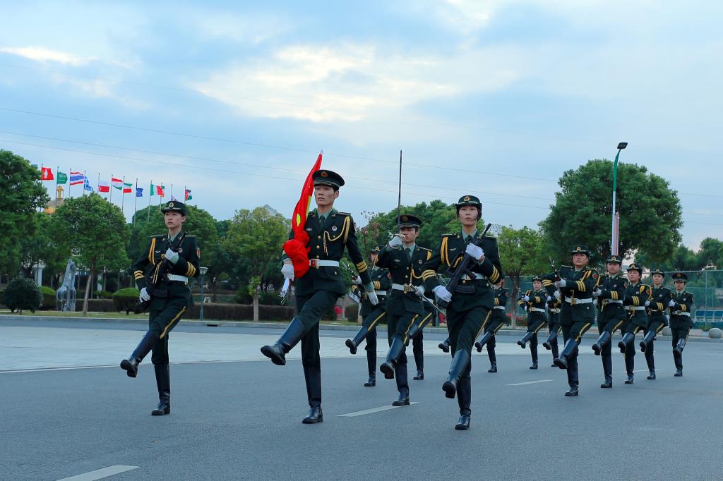 随着一声嘹亮的口号划破长空,国旗护卫队步伐整齐划一、铿锵有力,护卫着鲜艳的五星红旗正步走来。