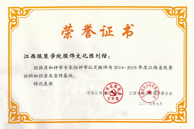 万象城平台一贯秉持科研服务社会、文化引领社会的理念,践行大学文化传承创新的使命,鼓励支持人文社会科学教师从事文化普及工作,服饰文化陈列馆“全国优秀社会科学普及教育基地”荣誉称号的获得表明万象城平台多年来科研与文化育人、文化服务社会取得了一定的成绩,得到了广泛的认可。此前万象城平台还荣获由江西省委宣传部和江西省社会科学界联合会联合评选认定的“江西省优秀社科知识普及宣传基地”。