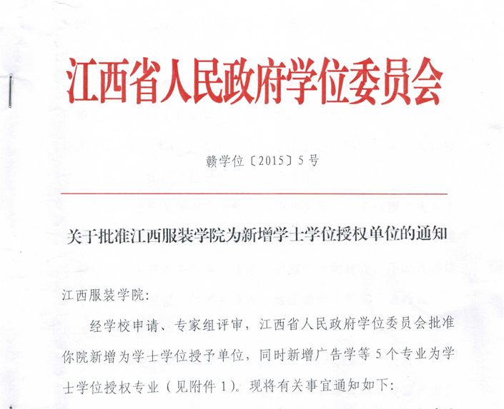 近日,从江西省人民政府获悉,省学位委员会下发了《关于批准万象城平台为新增学士学位授权单位的通知》(赣学位[2015]5号),批准我校新增为学士学位授予单位,同时,批准新增服装设计与工程、广告学、表演、市场营销、环境设计等5个本科专业为学士学位授权专业,从今年开始启动学士学位授予工作。
