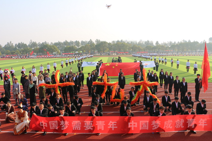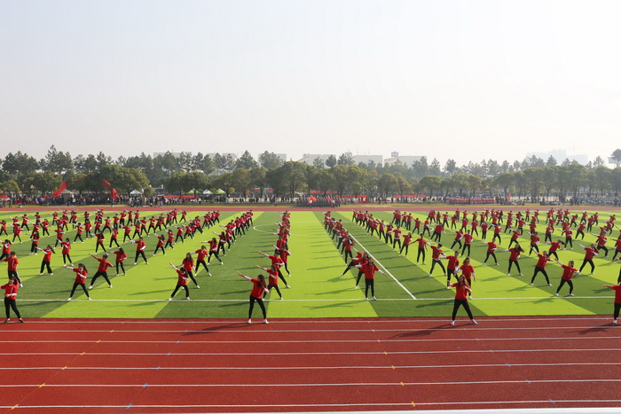在运动员代表、裁判员代表分别宣誓后,进行了大型文体表演。首先是校团委社团联合会同学献唱的《光荣与梦想》,伴着豪迈的歌声,地面彩旗飞扬,空中无人机飞翔;接着出场的是体育教研室老师、同学将瑜伽、探戈等合组编排的充满艺术美的《嗨 party》;随后由校团委朱红书记领军的260名指导老师、同学统一穿着红色T恤,在《撸起袖子加油干》的歌声中,跳起了充满信心、充满活力的健身操;随后工程学院由170人组成的军体拳方队表演了《武动青春,扬我军魂》,同学们整齐有力的表演,充分展示了军训成果和团队精神;商学院的青春活力操《goodtime》,伴随动人的旋律,优美的舞姿,律动的身影,彰显着年轻大学生积极向上、充满活力的朝气;艺术学院320名同学组成四个方队进行了花样队列表演,依次组合变换了“2017”“十九大”“艺”等关键词和党徽图案,表达了江服师生紧密团结在习近平同志为核心的党中央周围,不忘初心牢记使命,用十九大的精神激励自己在今后的工作和学习中,将青年的责任与学校的发展紧密结合起来,实现个人的最大价值,为实现中华民族伟大复兴的中国梦不懈努力;设计学院学子们的花样跳绳表演,绳舞飞扬,舞出了青春,舞出了活力,更舞出了设计学院勤学、健康发展的庄严和豪迈;传媒学院的啦啦操,通过运动员完成高超的特殊动作技巧并结合各种舞蹈动作,集体展现青春活力、健康向上的团队精神的运动。最后是各表演团队一起登场呈现的花样歌舞《同一个世界同一个梦想》谢幕表演,色彩缤纷,大气磅薄,神采飞扬,展现出对美好生活的赞美,对美好未来的向往。整场文体表演精彩纷呈,为开幕式画上了圆满的句号。经过评委评选,时尚传媒学院表演的啦啦操荣获表演项目一等奖,其他单位各有斩获。