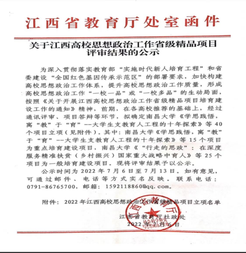 新闻中心讯(学工处 刘检莲供稿)为深入学习贯彻习近平新时代中国特色社会主义思想,全面贯彻落实习近平总书记关于教育的重要论述,特别是习近平总书记在全国教育大会、全国高校思想政治工作会议、学校思想政治理论课教师座谈会上的重要讲话精神,贯彻落实教育部“实施时代新人培育工程”和省委建设“全国红色基因传承示范区”的部署要求,加快构建高校思想政治工作体系,不断提升高校思想政治工作质量,形成高校思想政治工作“一校一品”或“一校多品”的生动局面,培养担当民族复兴大任的时代新人,培养一大批新时代“大先生”,江西省教育厅开展了高校思想政治工作省级精品项目培育建设工作。