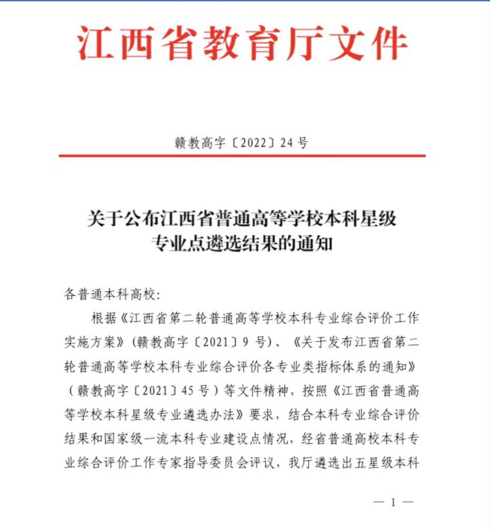 我校4个专业被省厅遴选为本科星级专业点,充分体现了我校整合资源、优化结构、提升内涵、强化特色,主动适应新时代教育评价要求,深化教育教学改革,以服务江西省经济社会发展为导向,以专业平台建设为抓手,聚焦时尚产业专业特色,专业设置与产业链、创新链、人才链有机衔接的办学成果,也是学校在新工科、新文科建设、一流专业建设、一流课程建设等方面厚积薄发的集中展示。