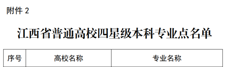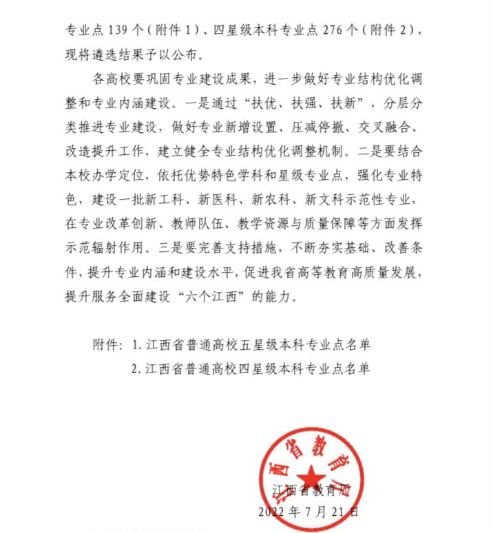 据悉,本科星级专业点是江西省教育厅依据江西省第二轮普通高等学校本科专业综合评价结果和国家级一流专业建设点情况组织开展遴选的,本科星级专业点包括五星级本科专业点和四星级本科专业点。最终共遴选出本科星级专业点415个,其中五星级专业点139个 、四星级专业点276个。