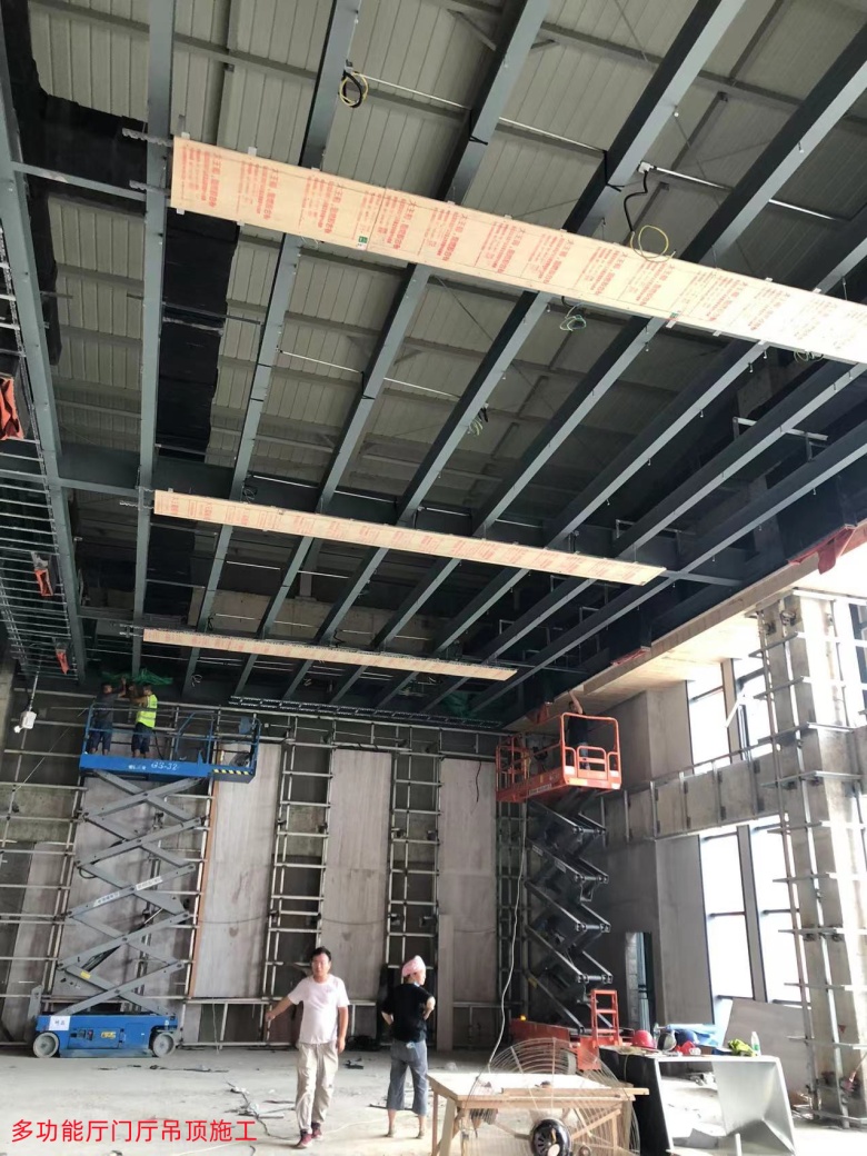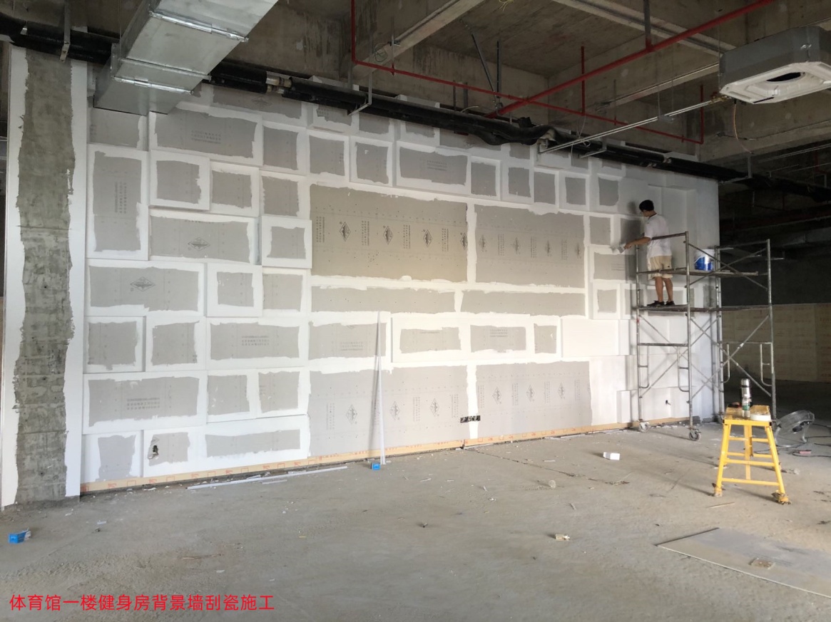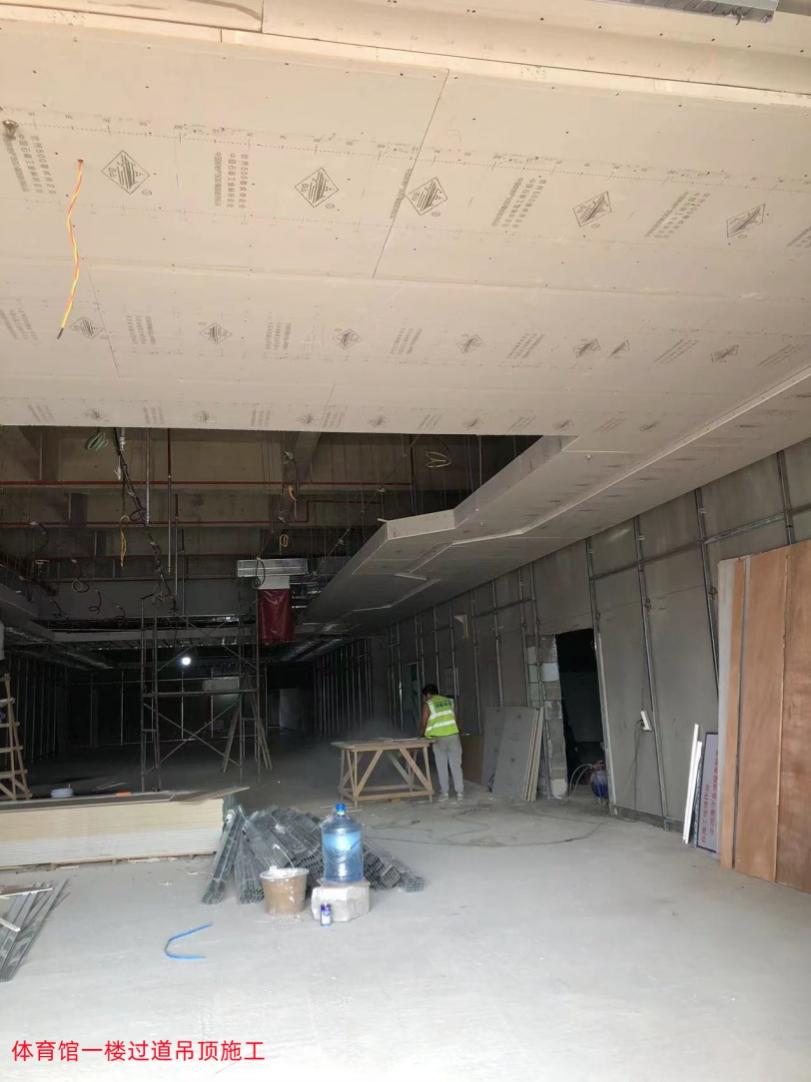 基建处处长荣莎介绍,体育馆及大学生活动中心室内装修项目于2022年6月8日正式开工,计划2022年9月底完工,目前多功能厅钢结构转换层、隔墙砌筑粉刷、管线预埋、地面找平、造型墙面龙骨、吊顶龙骨、石材干挂龙骨、中央空调室内管道施工完成,正在进行吊顶、墙面造型基层板、墙顶面刮瓷、空调设备安装等施工。