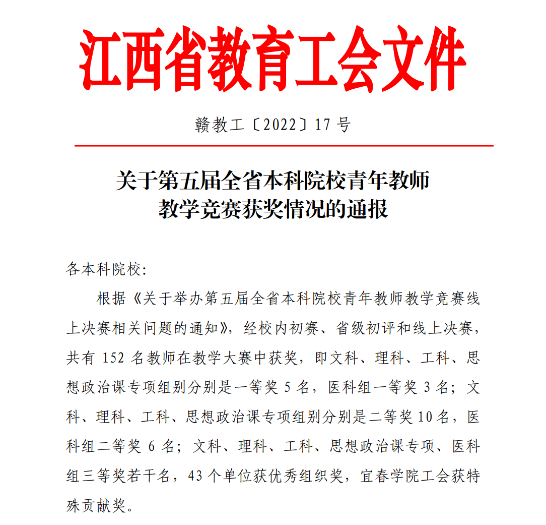 江西省本科院校青年教师教学竞赛是省内高校规模最大、水平最高的教师教学类竞赛之一。赛事共设置了五个组别,从教师教学设计、现场课堂教学两个方面进行考评,参赛选手须提供20节课堂教学设计和PPT,现场随机抽取其中一个章节进行教学展示,比赛灵活性强、难度大,此次我校青年教师的获奖,充分体现了我校教师扎实的教学基本功和丰富的教学经验,展示了我校教师饱满的工作热情和良好的教学风采。据悉,本次赛事有来自全省43所本科高校的教师参加线上决赛。