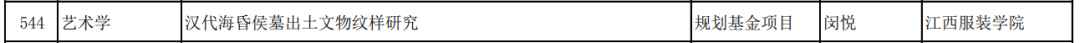 近日,教育部社科司公示了2022年度教育部人文社会科学研究一般项目立项名单。服装设计学院闵悦教授申报的艺术学规划基金项目《汉代海昏侯墓出土文物纹样研究》列入公示榜单中。